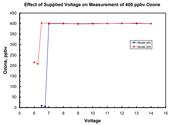 Both Model 202 and Model 205 Ozone Monitors will make accurate measurements in the applied voltage range of 7-14 V.