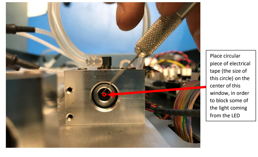 Explanation on how to decrease the photodiode voltage produced by the LED of your Model 405 by adding a small light barrier to the cell window.