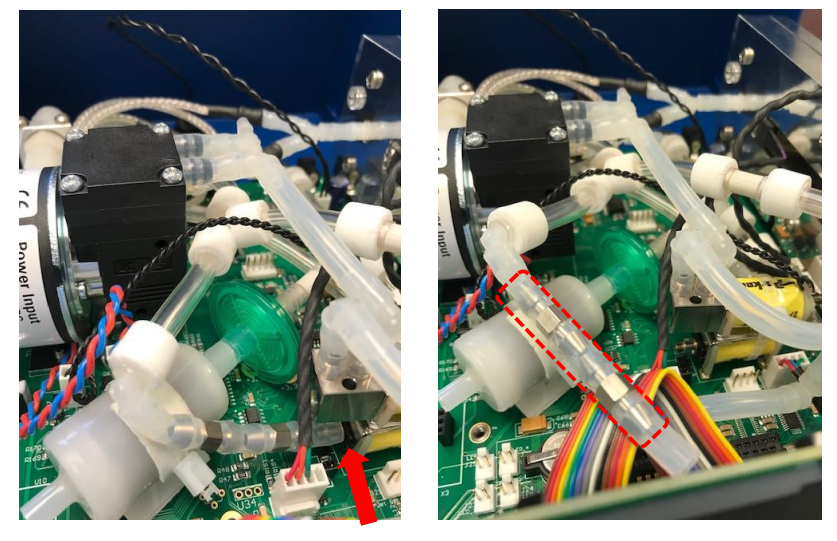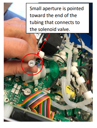 • Disconnect the silicone tubing from the solenoid valve at the point shown by the red
