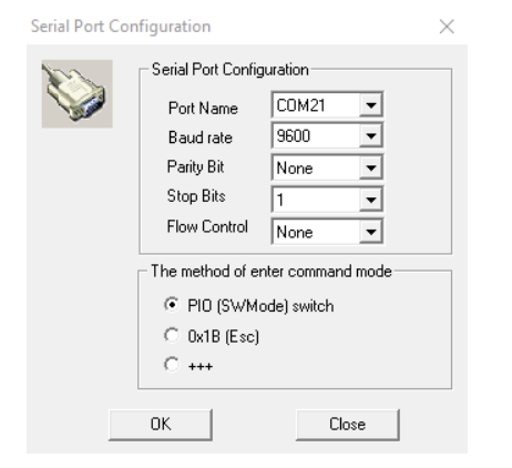 f. Select 9600 for the Baud rate, None for parity, 1 stop Bit, and None for Flow