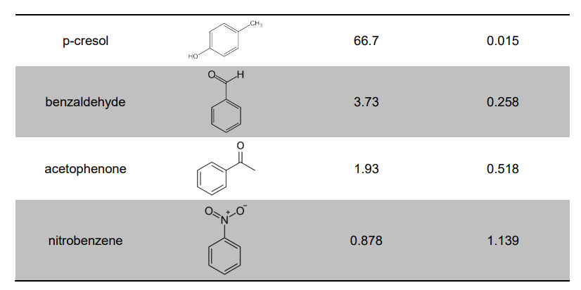 Substituted Aromatic VOCs. Aromatic rings with hydroxyl, carbonyl, nitro and other functional groups tend to have enhanced absorbance relative to unsubstituted compounds. Nitro aromatic compounds have especially high absorbances. Nitrobenzene, for example, absorbs about 14% more strongly than ozone at 254 nm. Fortunately, these compounds tend to be very low in concentration except in extremely polluted conditions.