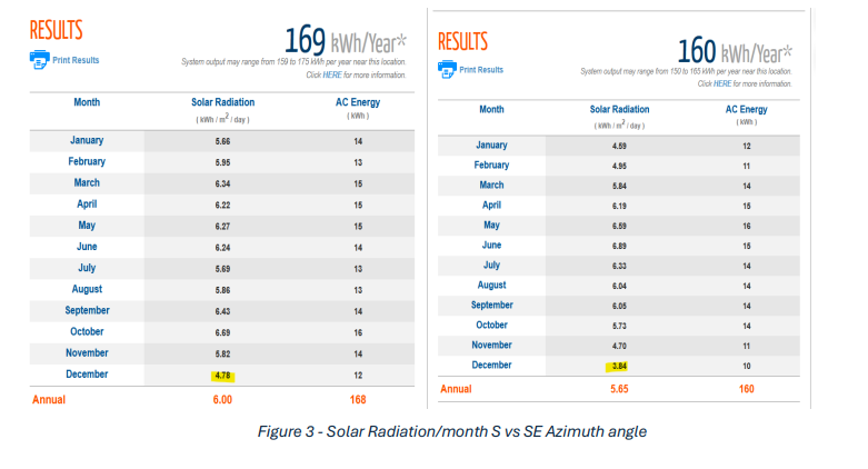 must face South in the northern hemisphere and North in the southern hemisphere. Adjusting the Azimuth angle from 180 (S) to 135 degrees (SE) sees average output drop from